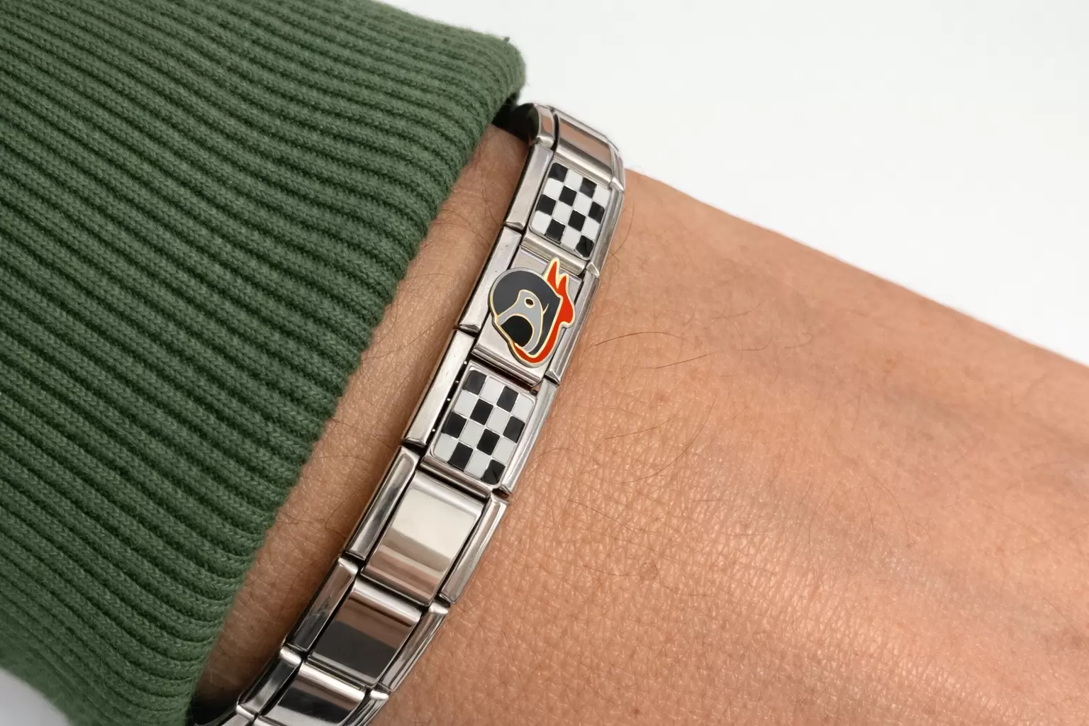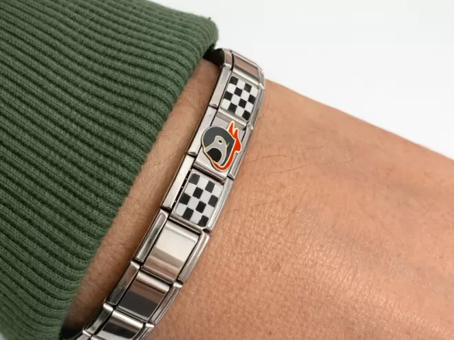 Edelstahlarmband, bei dem die Glieder durch einen Federmechanismus verbunden sind, wodurch ein Gummiband-Effekt entsteht.