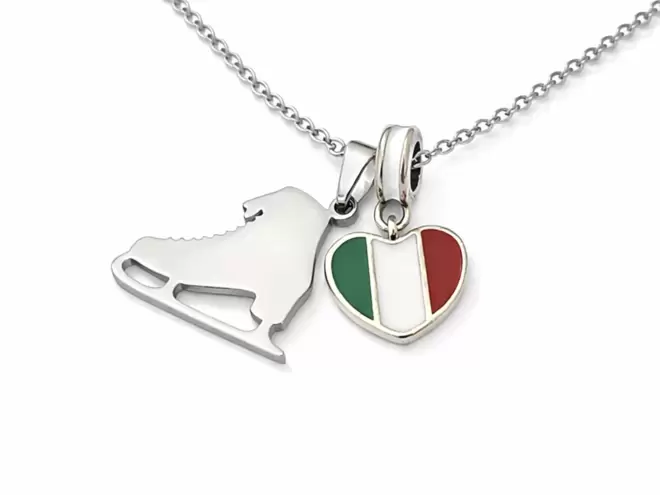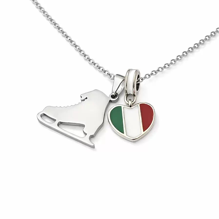 Un gioiello che racconta eleganza, passione e orgoglio italiano sul ghiaccio. Questo ciondolo in acciaio inox raffigura un pattino da ghiaccio dallo stile moderno e minimal, simbolo di equilibrio, grazia e determinazione. Il design è impreziosito dal cuore smaltato con i colori della bandiera italiana, per celebrare chi vive lo sport con emozione e spirito competitivo.