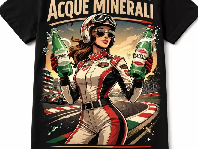 Il design raffigura una donna racing dal carattere deciso, simbolo di velocità, eleganza e spirito competitivo, mentre impugna due bottiglie di acqua minerale – naturale e frizzante – richiamando ironicamente il nome della curva. Il tutto in uno stile vintage moderno, con colori caldi e dettagli ispirati al mondo delle corse.
