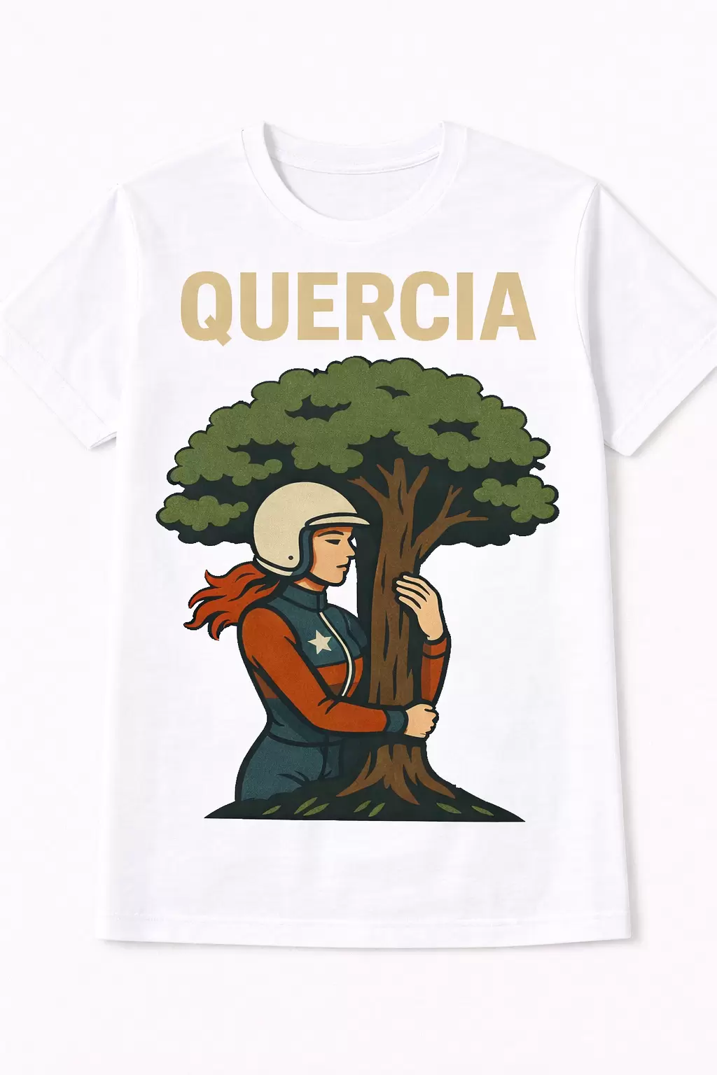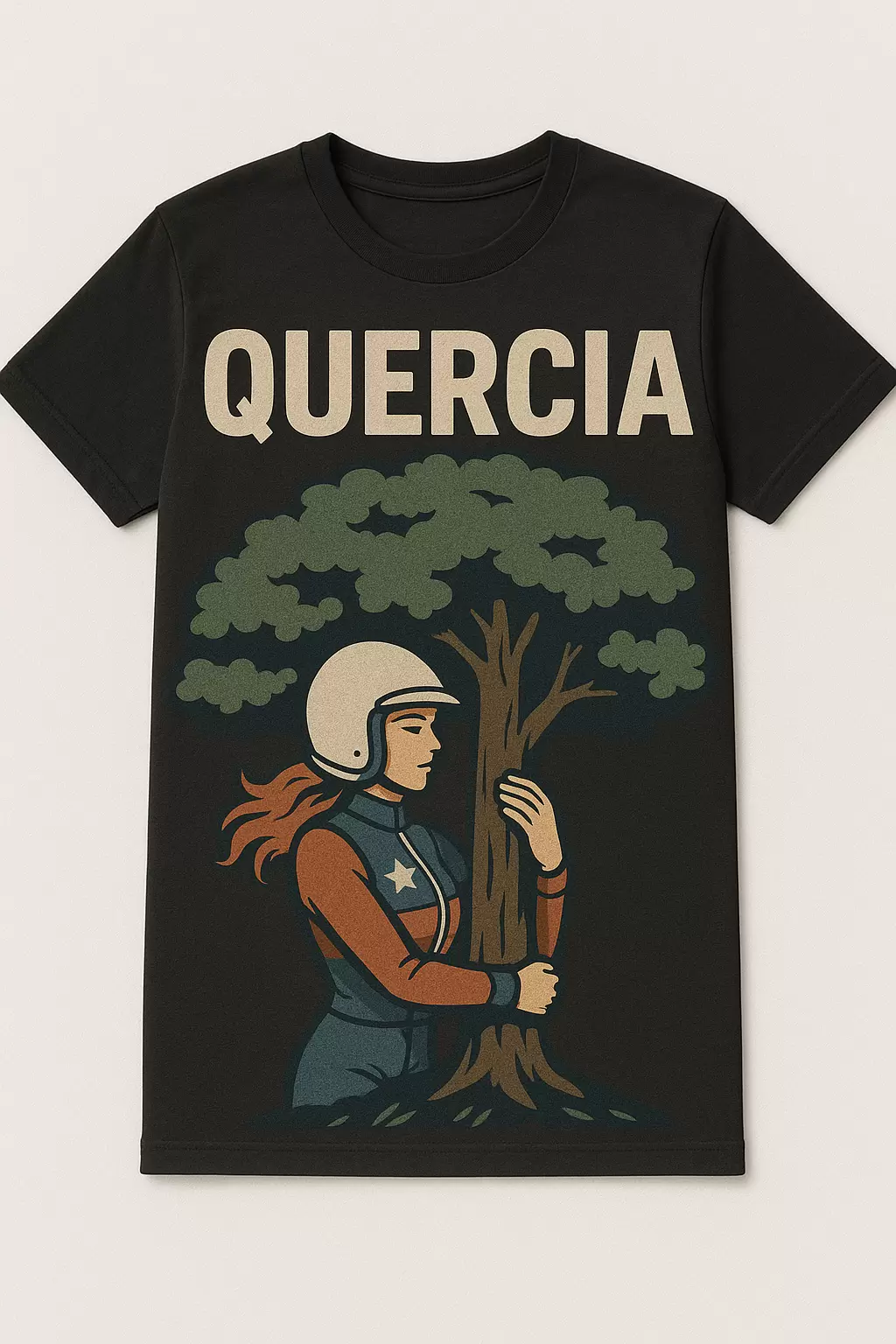 La grafica, in stile vintage racing, raffigura una donna pilota in un momento simbolico: l’abbraccio con una quercia, emblema di forza, equilibrio e radici. Un’immagine intensa che unisce il mondo delle corse a un significato più profondo, fatto di connessione, stabilità e carattere.