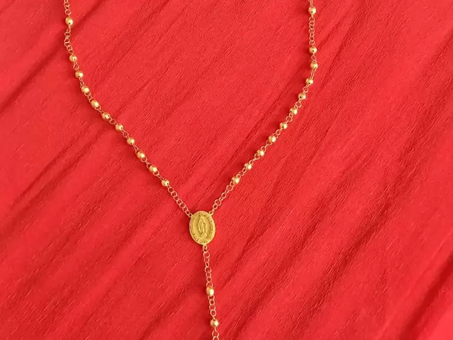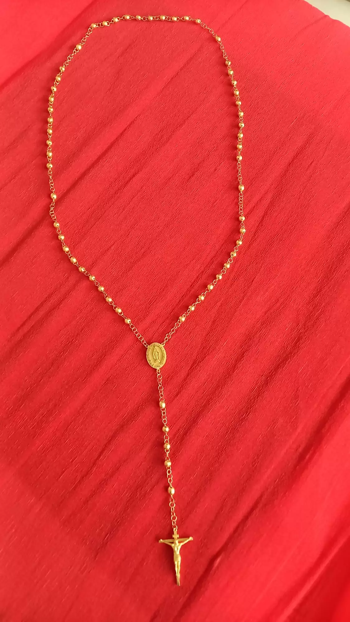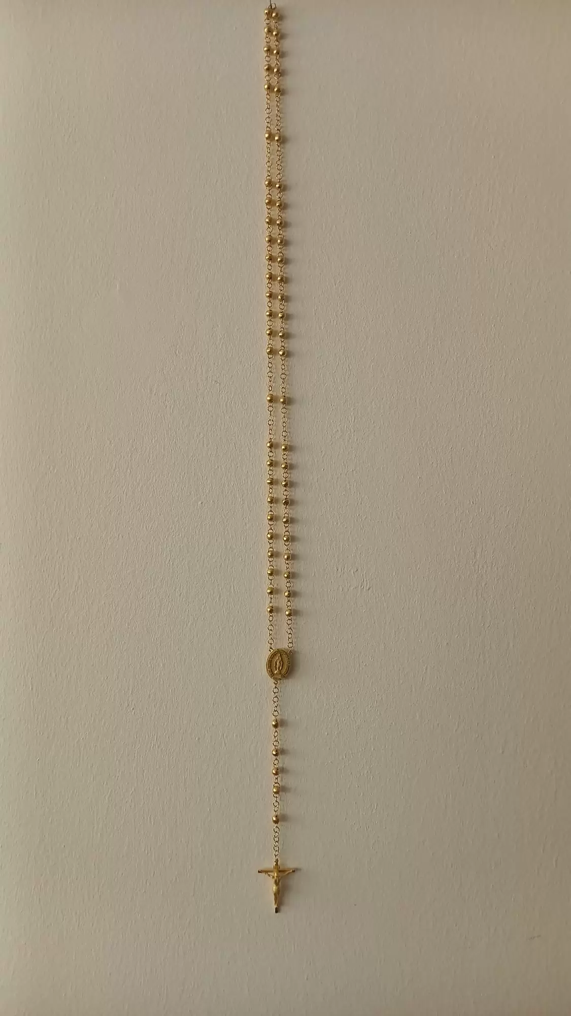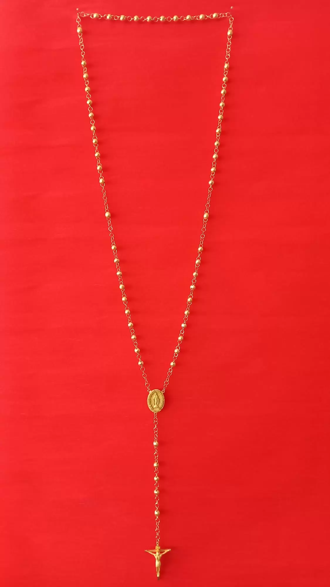 The chain is composed of perfectly handcrafted beads, joined by thin gold links that give harmony and strength to the jewel. In the center is the medal depicting the Miraculous Madonna, followed by the finely chiseled crucifix finial, both made with attention to detail.