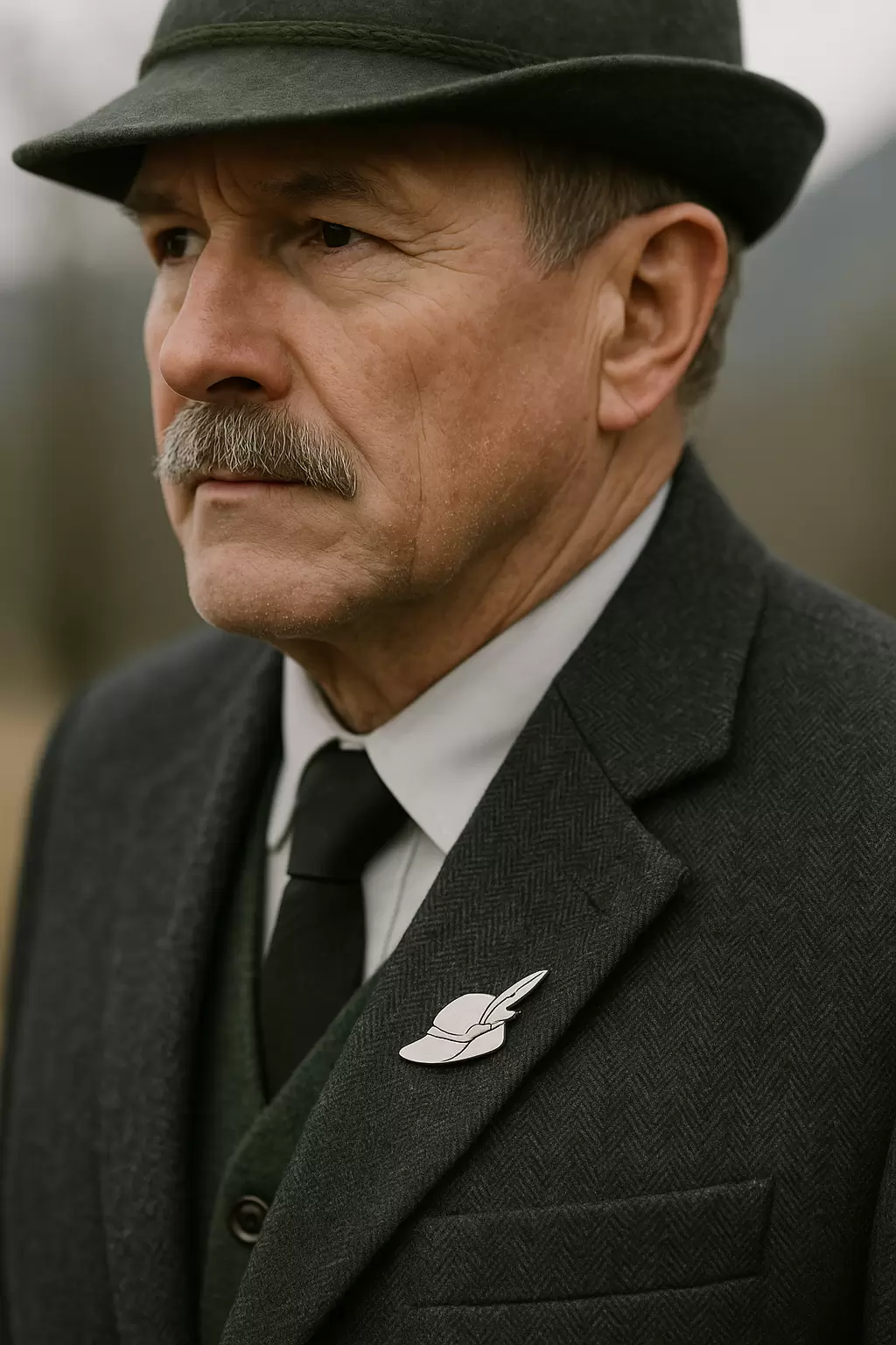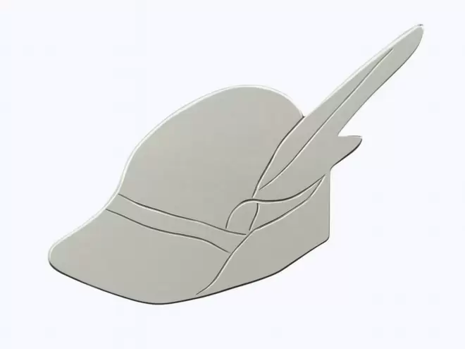 The Cappello Alpino brooch signed Gioielli Sotto la Cupola - Gianfranco Quartaroli is made of high-precision polished steel and reproduces the famous Alpini headgear with side feather, in a sober and refined design.