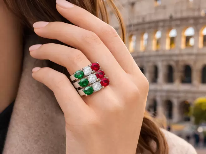 Descubra el encanto atemporal del anillo Tres Trilogías, una exclusiva joya de plata de ley 925 compuesta por 3 anillos unidos por una refinada banda. Su elegante diseño está adornado con luminosas circonitas en los colores de la bandera italiana -verde, blanco y rojo- que simbolizan estilo, pasión e identidad.