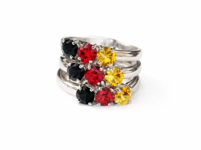 Descubra la elegancia decisiva del anillo Tres Trilogías, una exclusiva joya de plata de ley 925 compuesta por 3 anillos unidos por una refinada banda. El diseño trilogía se realza con circonitas cúbicas luminosas en los colores de la bandera alemana - negro, rojo y amarillo - para un efecto brillante, original y de gran personalidad.