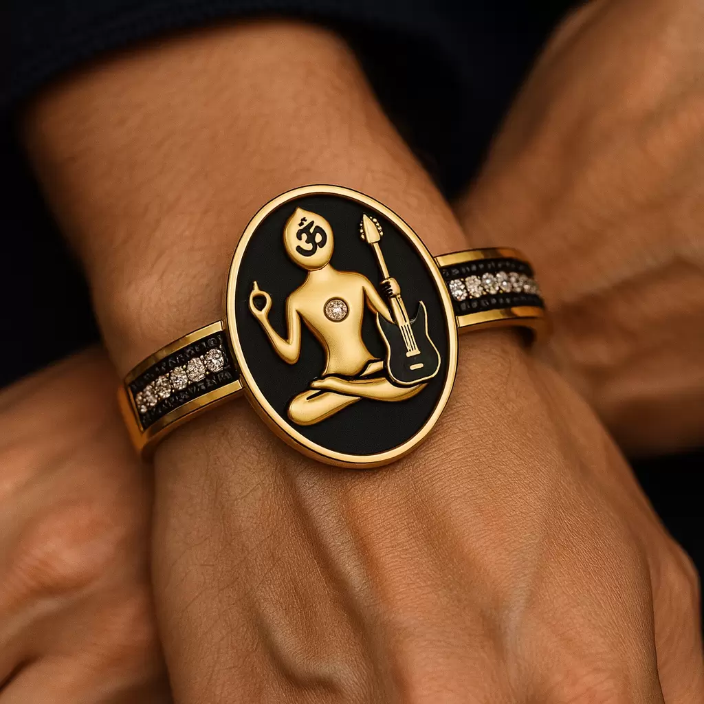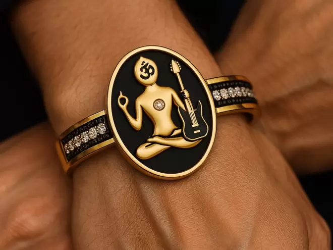 Combinación de meditación y rock: la energía espiritual del yoga se funde con el poder de la música rock en una joya que simboliza el equilibrio y el carisma.