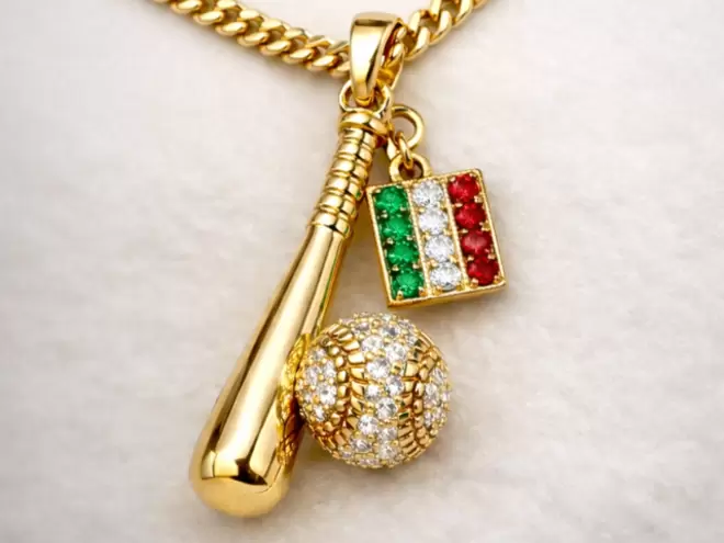 Una joya exclusiva que combina pasión deportiva y lujo. Este collar consta de un elegante colgante que representa un bate y una pelota de béisbol, adornado con diamantes naturales y acompañado de un charm de la bandera italiana realizado con piedras preciosas. Un diseño refinado y original concebido para quienes adoran destacar con un accesorio de fuerte personalidad.
