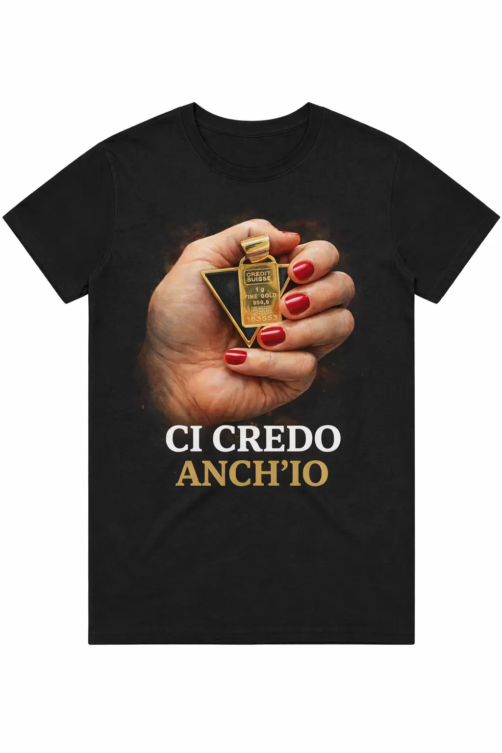 El impactante gráfico representa una mano femenina con esmalte rojo agarrando un lingote de oro, símbolo de valor, ambición y confianza. Debajo, la icónica inscripción "YO TAMBIÉN LO CREO" completa un diseño fuerte, directo y reconocible al instante.