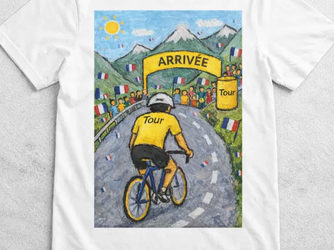 Celebra la leyenda del ciclismo con esta camiseta de gran impacto dedicada al maillot amarillo. El gráfico representa a un ciclista escapando hacia la línea de meta "ARRIVÉE", rodeado de montañas, espectadores jubilosos y banderas francesas, símbolo del épico Tour.