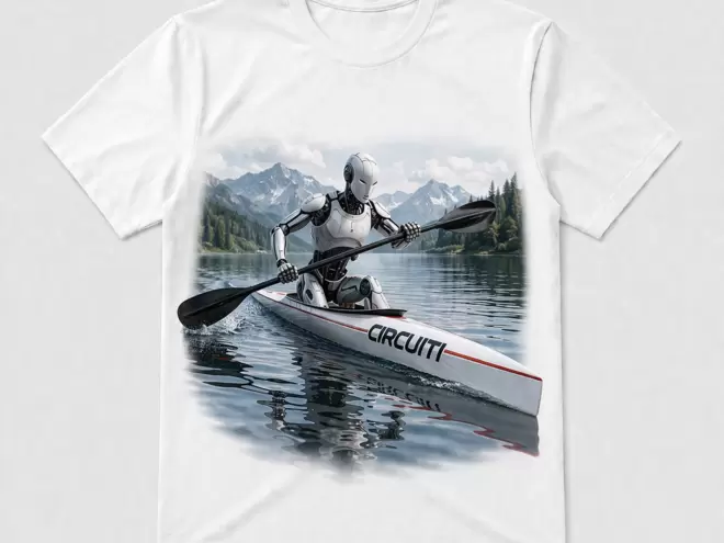 Destaca con una camiseta única que combina tecnología y deportividad. Esta camiseta blanca presenta un llamativo gráfico: un humanoide futurista remando una canoa de carreras, símbolo de velocidad, precisión e innovación.
