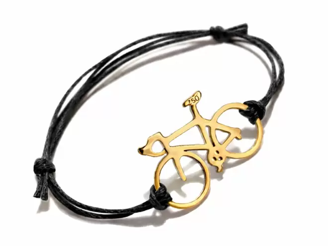 Le bracelet est disponible avec un choix de cordon en coton ciré noir, rose, jaune, rouge et sur demande la bicyclette est disponible en or 750 jaune ou rose.