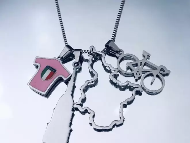Pour l'occasion spéciale, l'orfèvre piémontais Gianfranco Quartaroli a créé un bijou unique qui contient toute l'essence de l'événement, le collier sur lequel sont accrochés les charms qui représentent le plus cet événement sportif de haut niveau: maillot rose, Dôme de San Gaudenzio, Silhouette du Piémont et l'incontournable vélo de course.