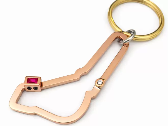 Il circuito di Monza, conosciuto in tutto il mondo come il Tempio della Velocità, prende vita in un portachiavi realizzato in tre ori preziosi, per unire design raffinato e anima sportiva.