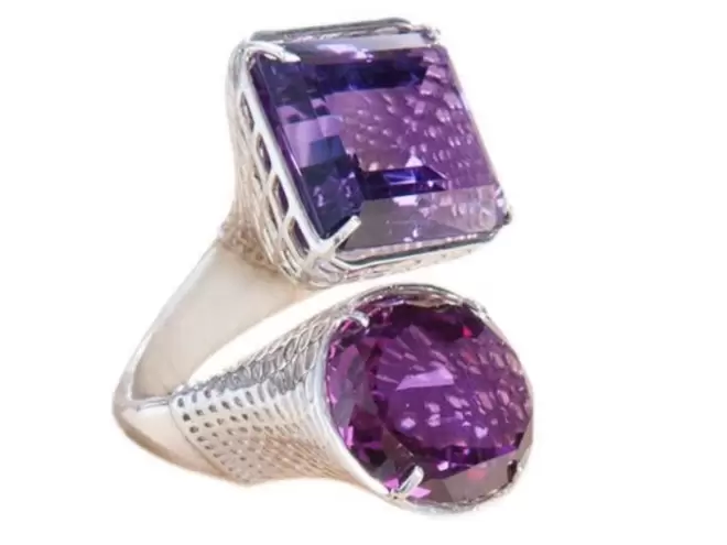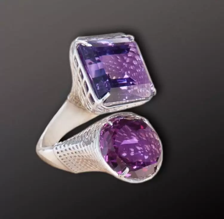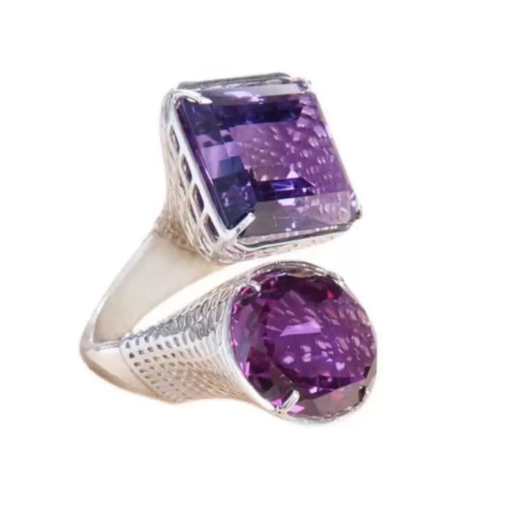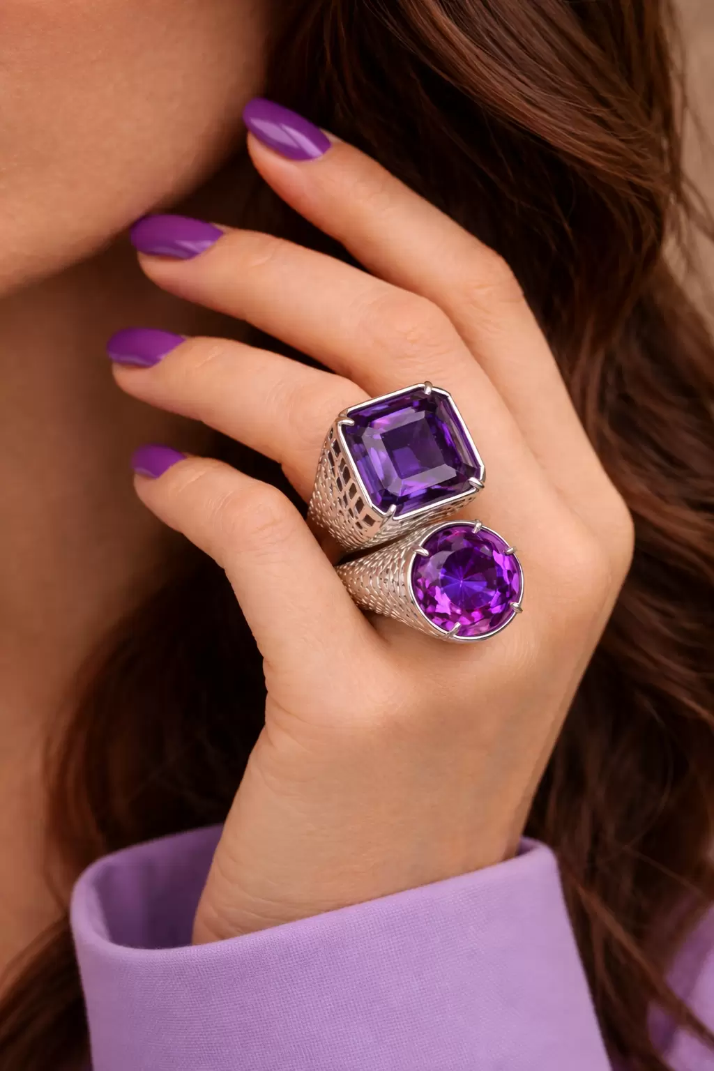 O protagonista absoluto é o duplo encontro de ametistas naturais de dimensões generosas: uma pedra de lapidação quadrada facetada e uma pedra de lapidação oval brilhante, ambas caracterizadas por intensas tonalidades violetas que captam a luz e realçam a mão com um efeito luminoso e sofisticado.