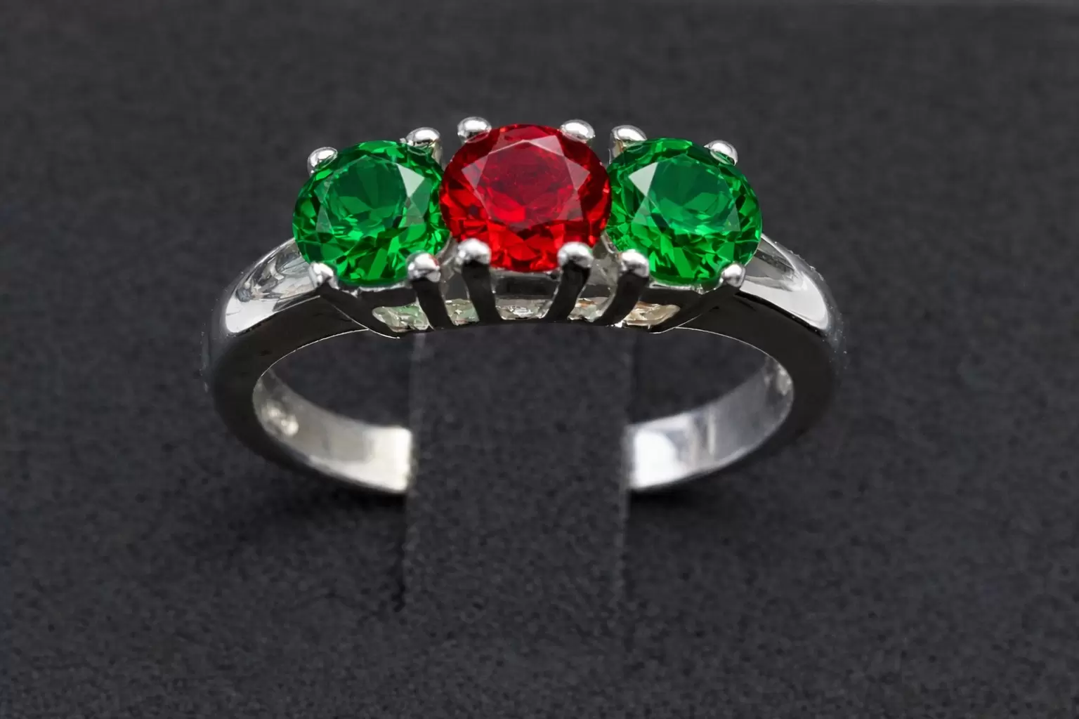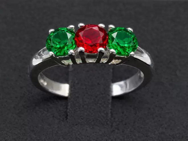 Anel trilogia em prata de lei 925 com zircónias cúbicas inspirado nas cores da bandeira de Portugal: verde, vermelho e verde. Uma joia com um design elegante e simbólico, concebida para quem deseja usar um acessório requintado que relembre emoções, viagens e laços especiais.