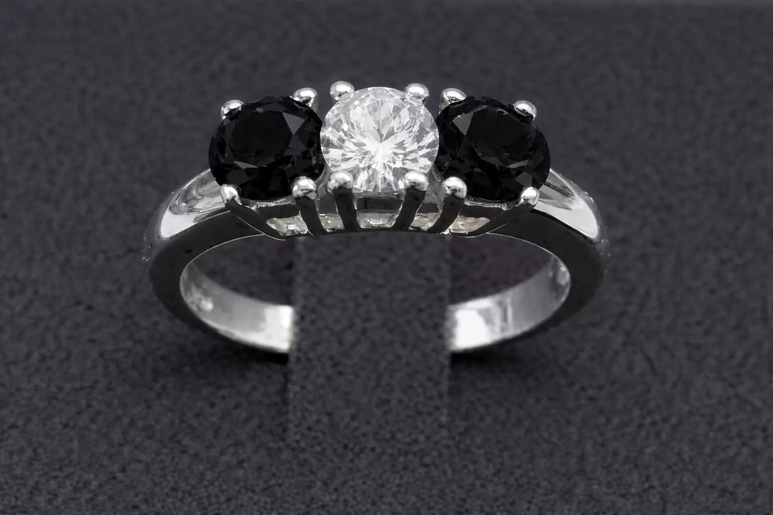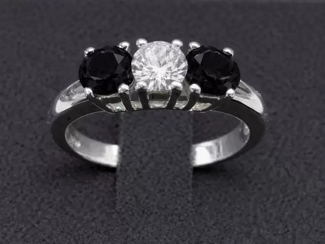 A combinação de cores preto, branco e preto cria um contraste refinado e luminoso: o zircão branco central brilhante confere luz e pureza, enquanto os dois zircões pretos laterais acrescentam profundidade, mistério e um toque contemporâneo.