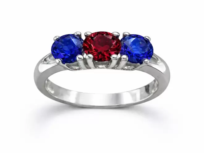 Fabricado em prata de primeira lei 925 revestida a ródio, este anel trilogia alia requinte e carácter graças à combinação de cores inspirada nas cores blaugrana: dois zircões azuis intensos nas laterais e um zircão granada central, brilhante e profundo.