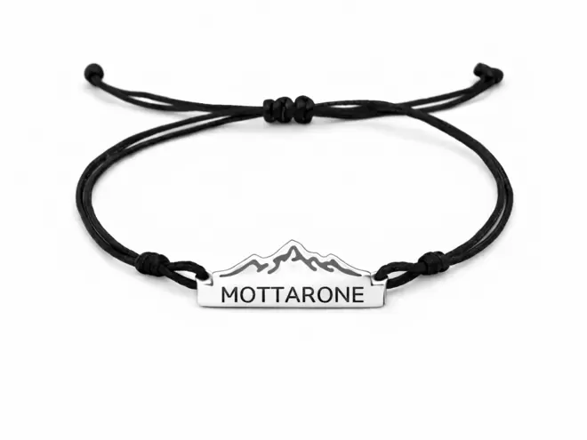 La piastrina centrale in argento 925 raffigura un profilo stilizzato delle cime, sotto il quale è incisa la scritta Mottarone, simbolo di natura, libertà e legame con il territorio.