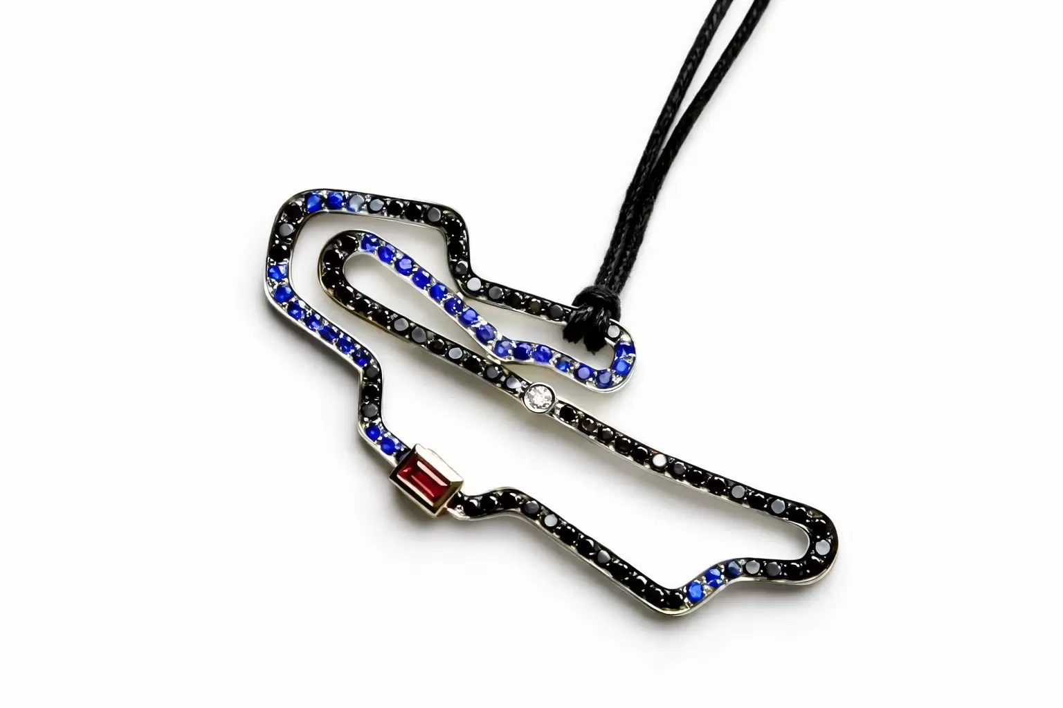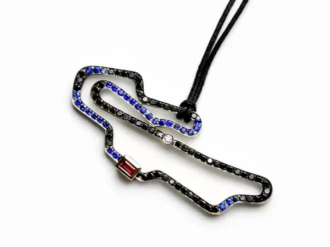 A luneta deslizante com rubi em corte baguete representa carros de corrida na pista.