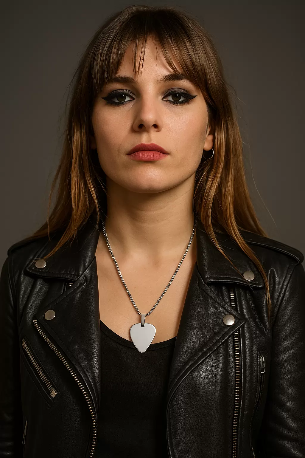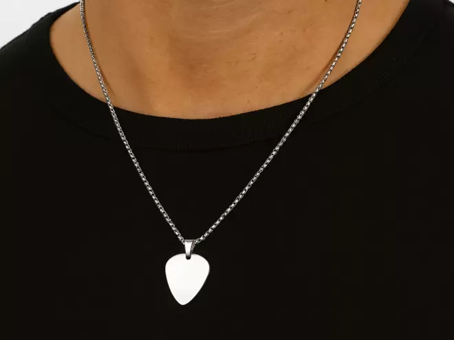 Um símbolo de liberdade, ritmo e personalidade. O pendente de plectro em aço recorda a forma icónica utilizada pelos músicos de todo o mundo, transformada numa peça de joalharia com um design minimalista e elegante.