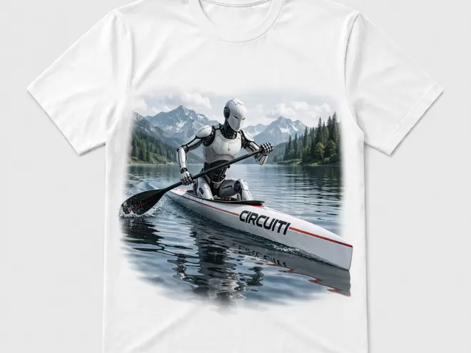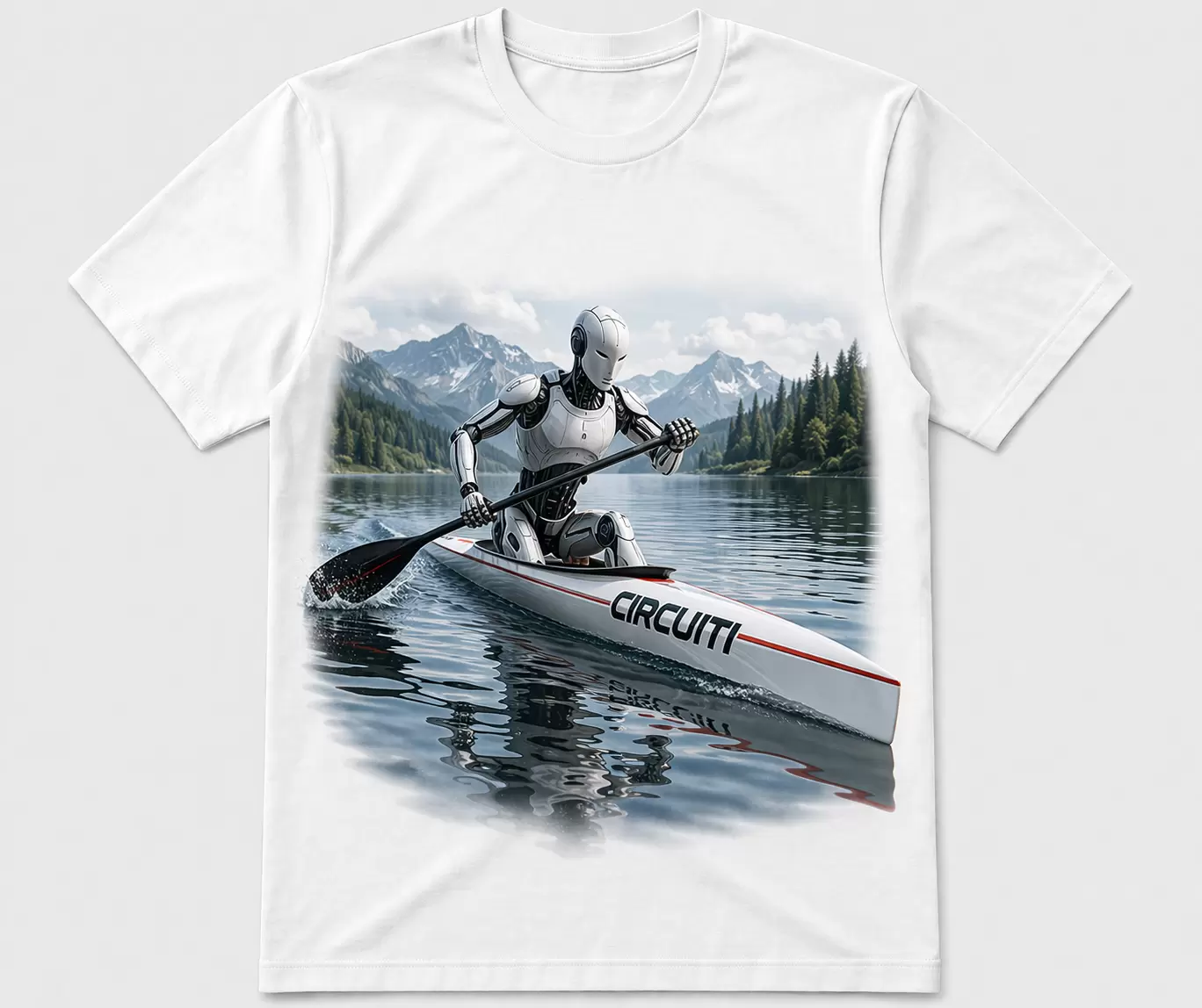 Destaque-se com uma t-shirt única que alia tecnologia e desportivismo. Esta t-shirt branca apresenta um grafismo marcante: um humanoide futurista a remar numa canoa de corrida, simbolizando a velocidade, a precisão e a inovação.