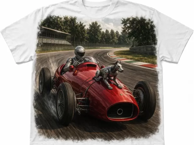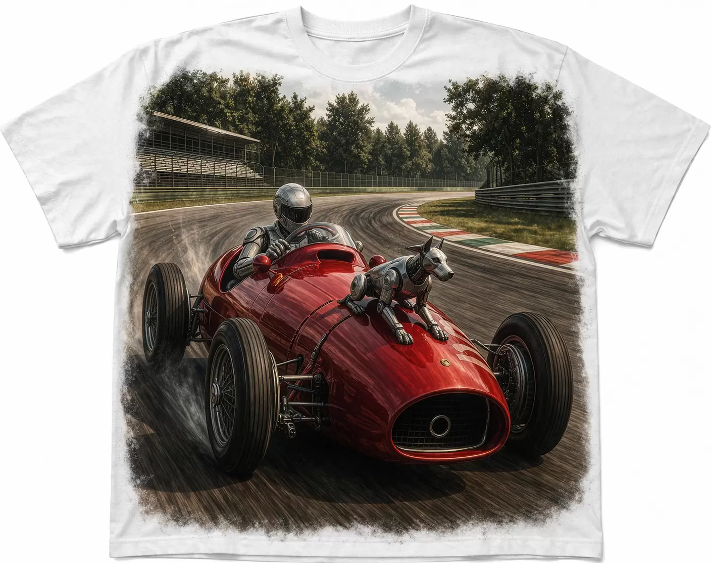 Experimente a emoção da velocidade com esta T-shirt única que combina um estilo vintage com uma visão futurista. O design retrata um monolugar clássico dos anos 50 lançado numa curva, conduzido por um humanoide de alta tecnologia, enquanto um cão robótico domina o capot, num equilíbrio perfeito entre potência e inovação.