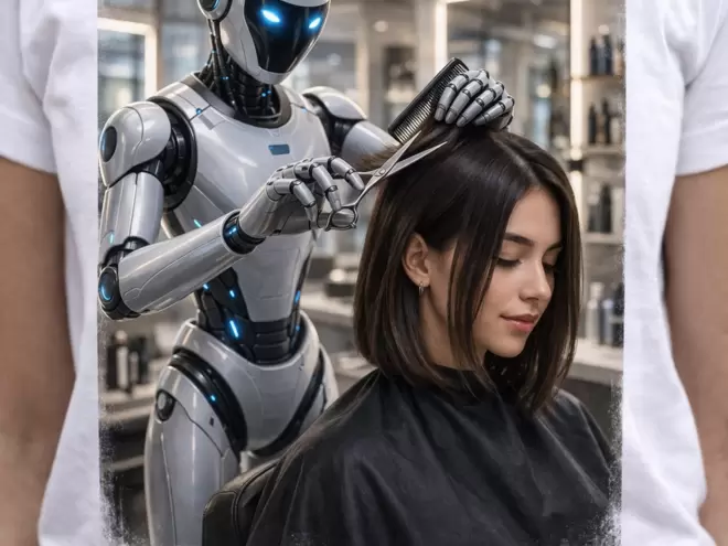 Traga o futuro para o seu estilo quotidiano com esta original T-shirt para mulher, com um estampado artístico único: um sofisticado robô humanoide a fazer um corte de cabelo impecável. Uma mistura perfeita de tecnologia e beleza, ideal para quem gosta de se destacar de forma criativa.