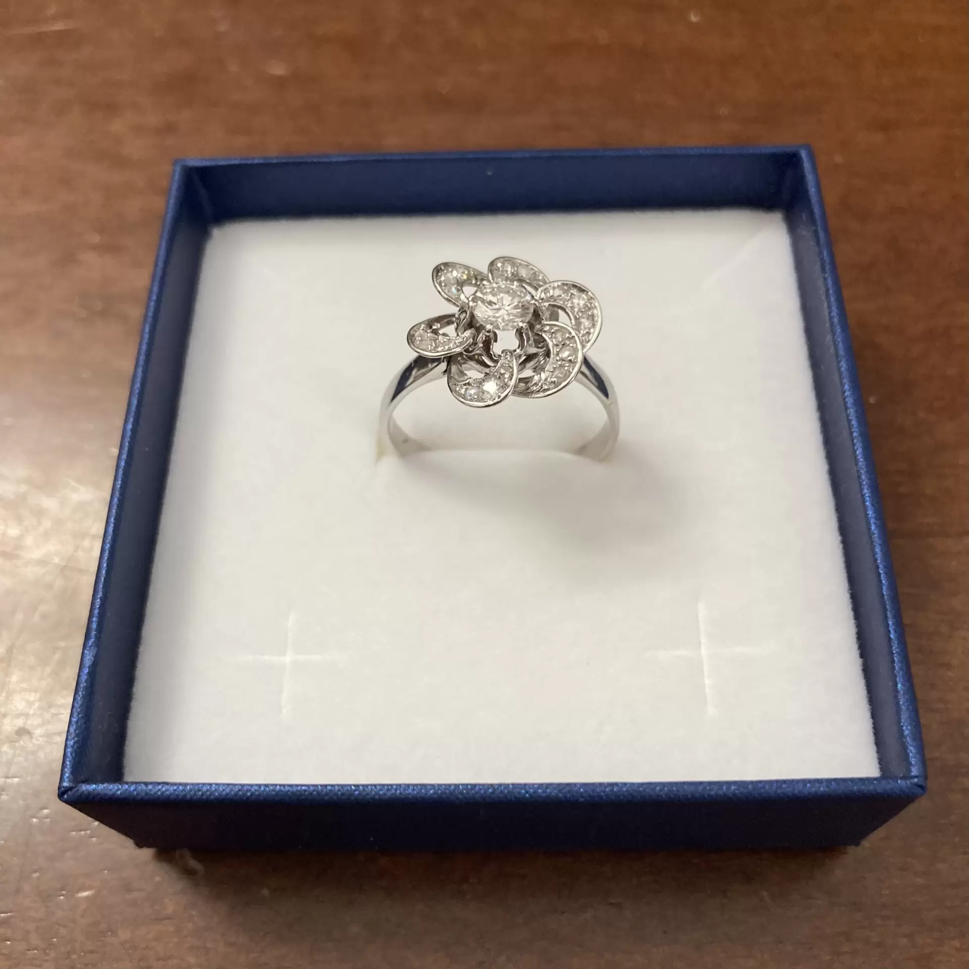 Questo anello in oro bianco è impreziosito da un luminoso diamante centrale da 0,30 carati, protagonista assoluto della composizione. Intorno alla pietra principale si sviluppa un delicato design floreale, formato da petali in oro bianco arricchiti da piccoli diamanti incastonati che amplificano la brillantezza e creano un effetto scintillante ad ogni movimento della mano.