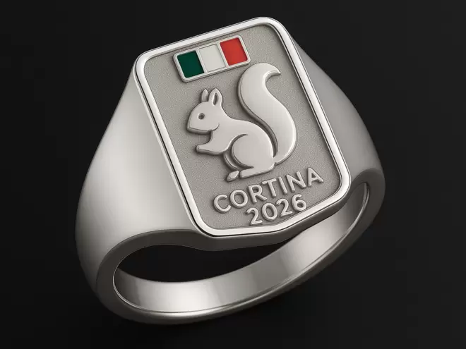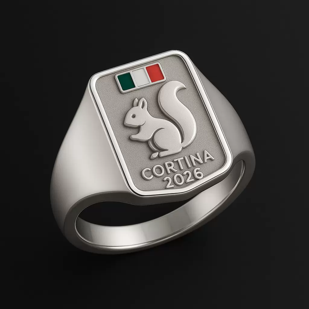 Questo anello chevalier in argento 925 presenta sul piano frontale lo scoiattolo delle Dolomiti in bassorilievo, emblema di Cortina, accompagnato dallo smalto tricolore italiano e dall’incisione CORTINA. Un design elegante e raffinato che celebra la natura, la città e le Olimpiadi Invernali 2026.