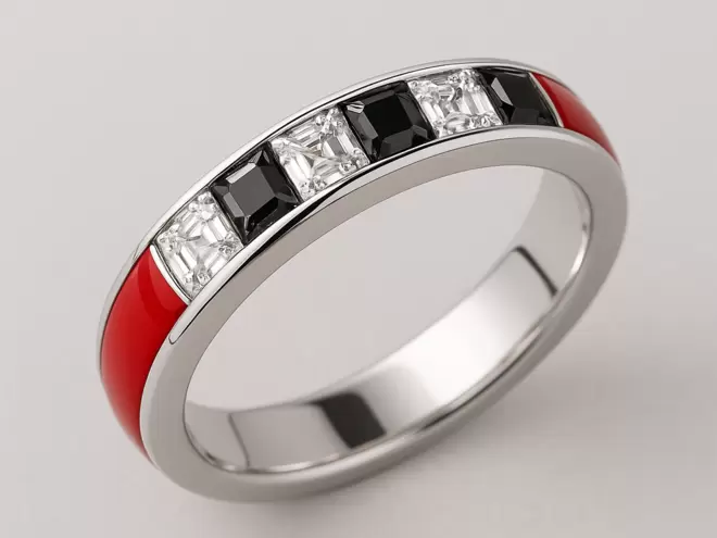 La fascia è scandita da diamanti bianchi e neri taglio carré alternati, come la bandiera a scacchi che decreta la vittoria in Formula 1 e MotoGP,mentre lo smalto rosso corsa avvolge i fianchi con l’energia e la passione delle rosse.