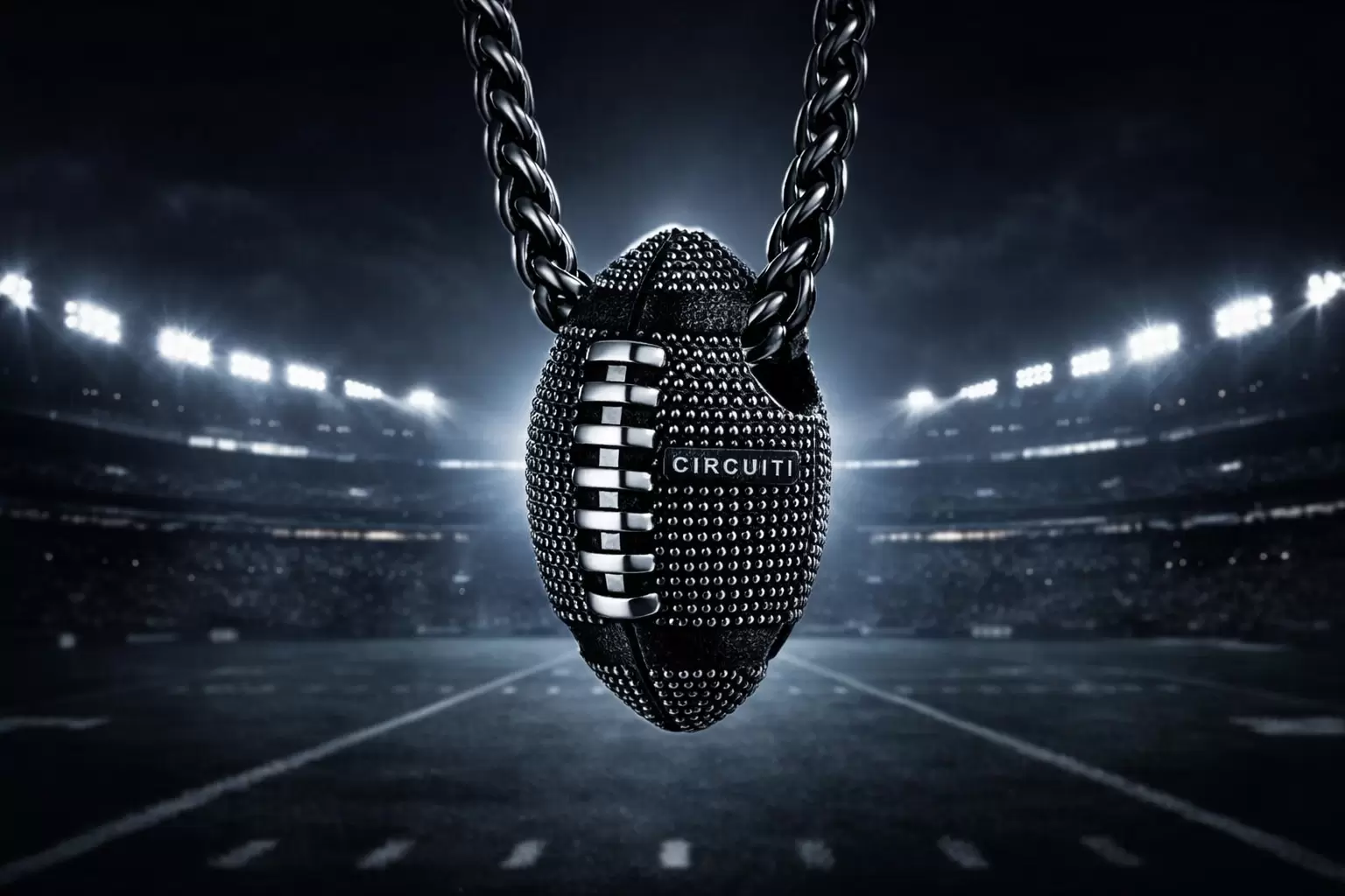 CIRCUITI · Night Game è un ciondolo iconico che trasforma il football americano in un gioiello di alta gamma. Ispirato alle grandi notti NFL e all’energia del Super Bowl, unisce design contemporaneo, carattere sportivo e maestria orafa italiana.