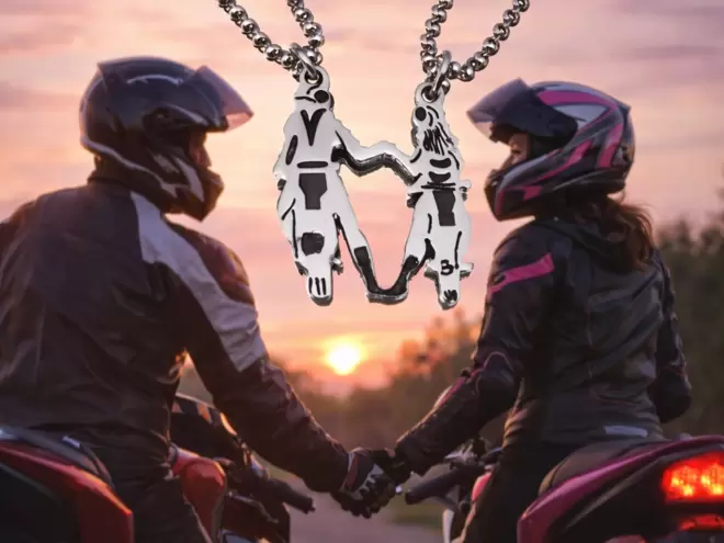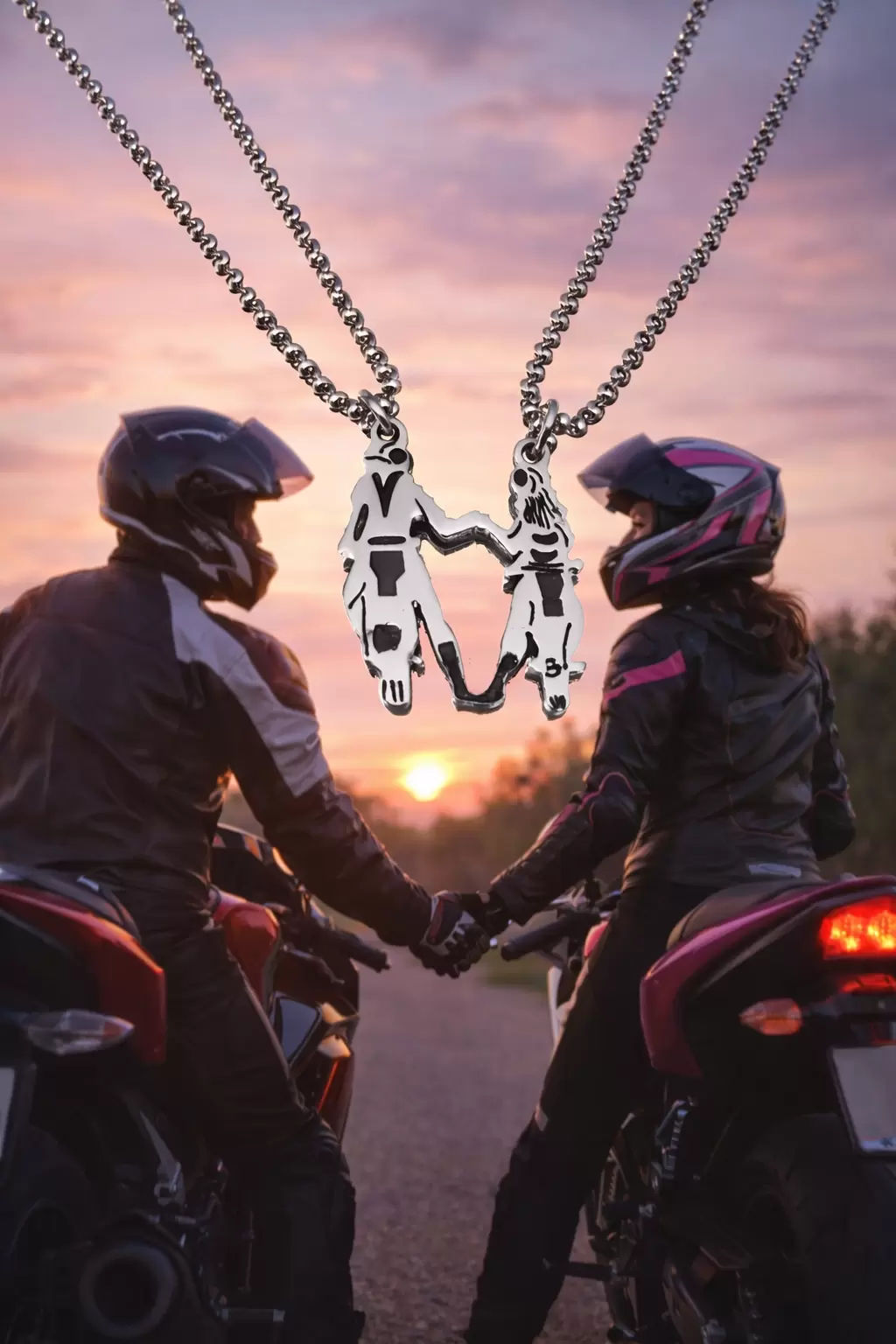 Il ciondolo motociclista "LUI & LEI" é dedicato a tutti i motociclisti,motocicliste e zavorrine innamorati.Il ciondolo ideato da Gianfranco Quartaroli è realizzato interamente in Italia;inciso a laser si puo'spezzare in 2 e viene consegnato con 2 catenine a palline in acciaio.