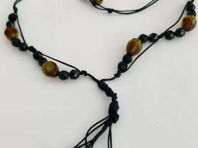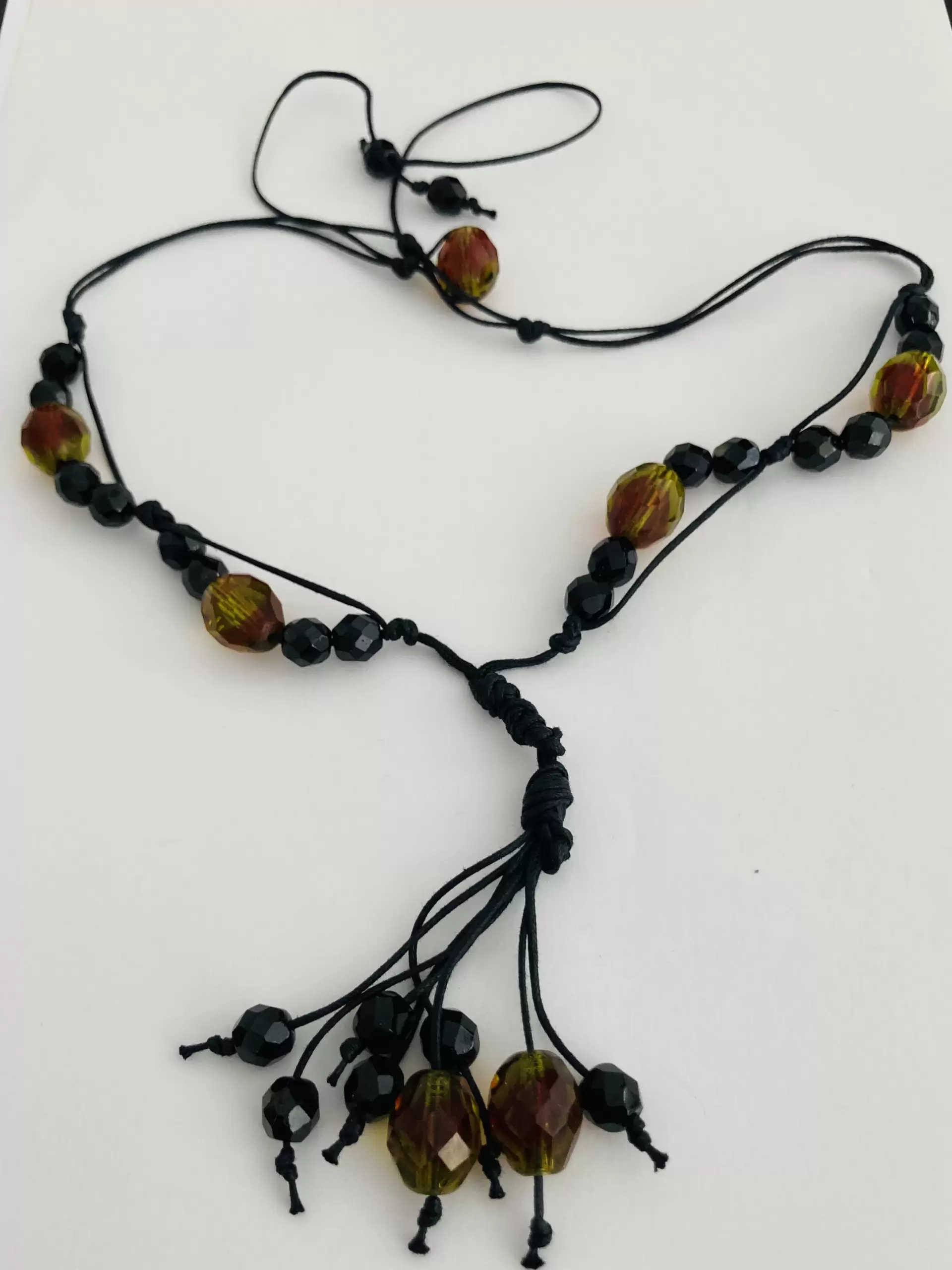 Collana in cristallo nero,murrine color ambra,filo cerato nero,ciondoli a cravatta,chiusura a bottone.