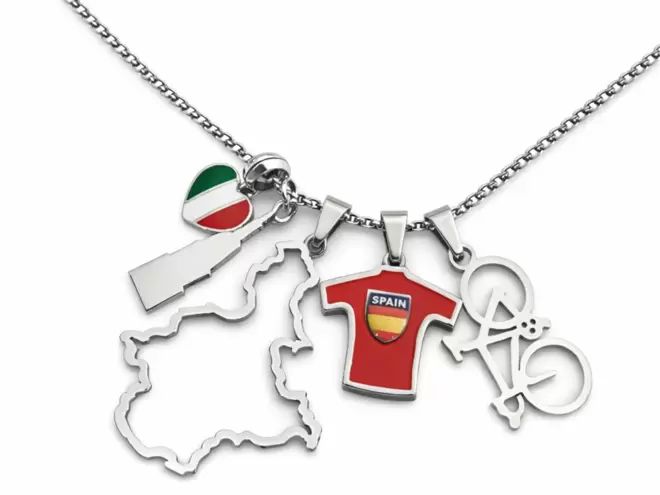 L'artista orafo piemontese Gianfranco Quartaroli ha ideato e realizzato la collana in acciaio con i charms che più identificano l'eccezionale evento: cuore con bandiera Italia,Cupola di san Gaudenzio,Silhouette Regione Piemonte,Maglia Rossa,bici da corsa.
