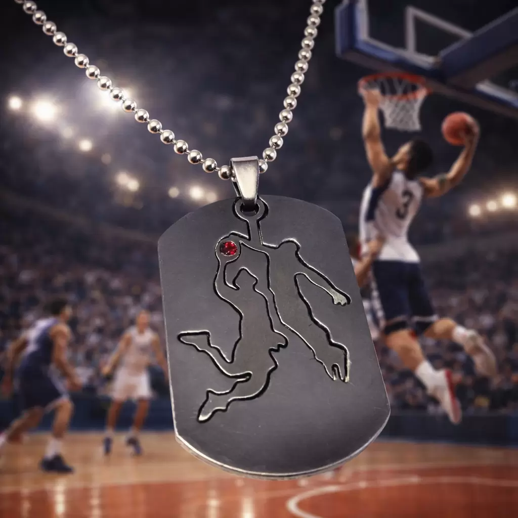 Piastra in Acciaio altezza cm. 3,7 Larghezza cm.2,4 impreziosita da un rubino naturale incastonato a mano nel punto del pallone.