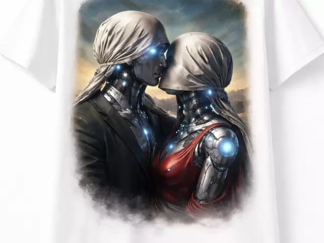 Un design intenso e suggestivo che reinterpreta il concetto di amore in chiave futuristica. Questa t-shirt bianca raffigura due umanoidi avvolti in un momento intimo, con i volti coperti da veli, richiamando un’estetica surrealista e misteriosa.