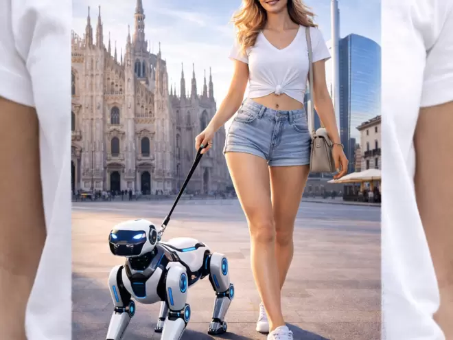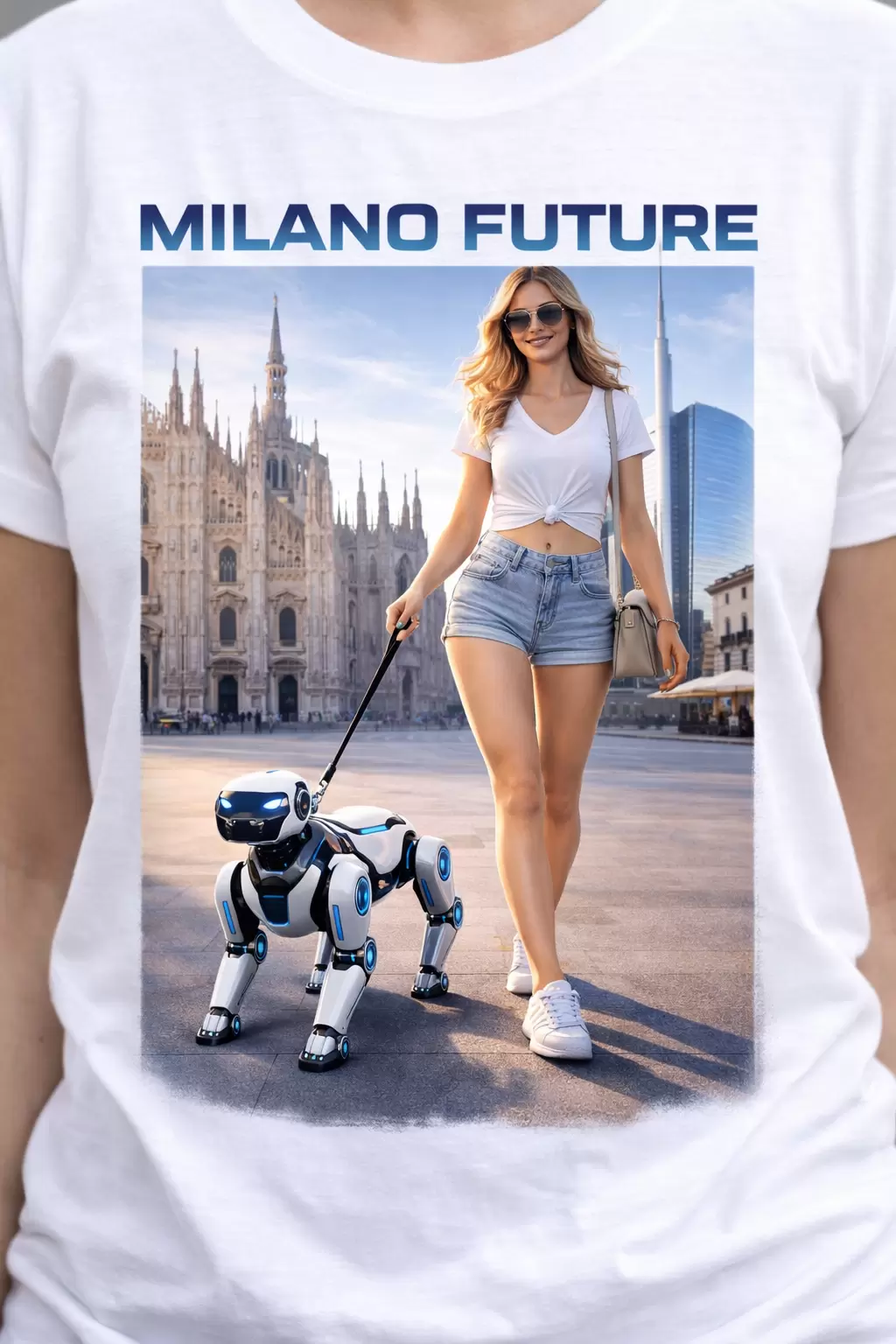 Scopri il perfetto equilibrio tra eleganza italiana e visione futuristica con la t-shirt “Milano Future”. Il design raffigura una scena iconica nel cuore di Milano, dove una figura moderna passeggia con un cane robotico, simbolo di un futuro sempre più tecnologico. Sullo sfondo, l’inconfondibile skyline milanese unisce storia e innovazione in un’unica immagine d’impatto.