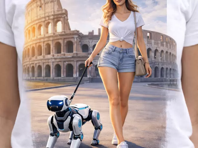 Unisci la grandezza della storia romana con l’energia del futuro grazie alla t-shirt “Roma Future”. Il design mette in scena una passeggiata moderna accanto al maestoso Colosseo, reinterpretato in chiave contemporanea con la presenza di un cane robotico. Un mix sorprendente tra passato eterno e innovazione tecnologica.