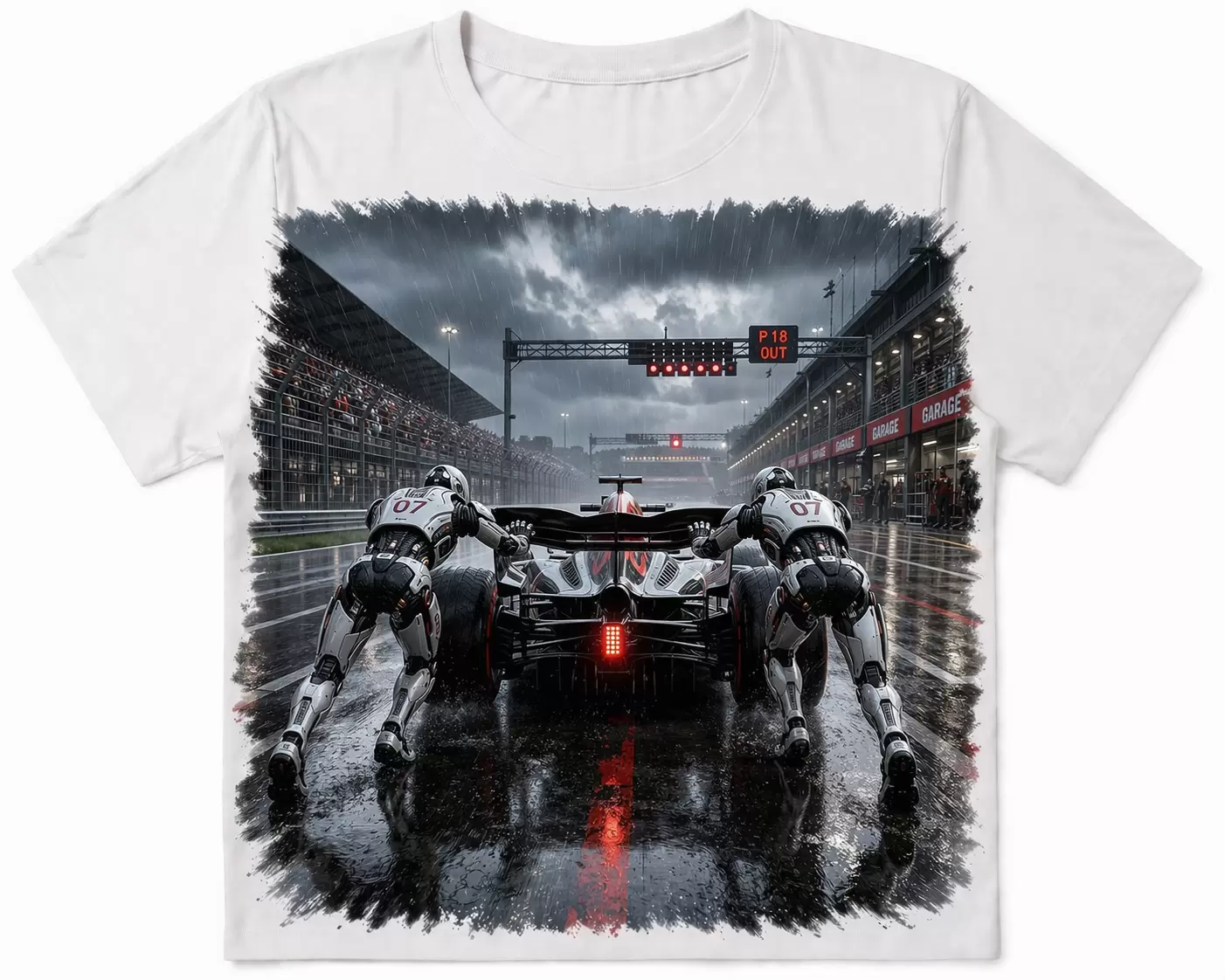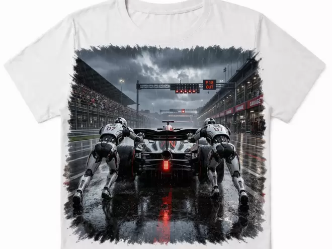 Quando la velocità si ferma… entra in gioco la tecnologia. Questa t-shirt esclusiva racconta un momento unico nel mondo delle corse: una monoposto in panne sotto la pioggia, spinta da due umanoidi futuristici in una scena intensa e cinematografica.
