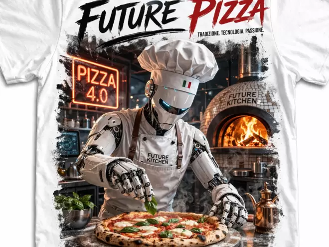 Il design mostra un pizzaiolo umanoide all’opera, mentre prepara una pizza perfetta con precisione digitale, in una cucina high-tech. Sullo sfondo, elementi moderni si fondono con dettagli tradizionali, dando vita a una scena unica e sorprendente.