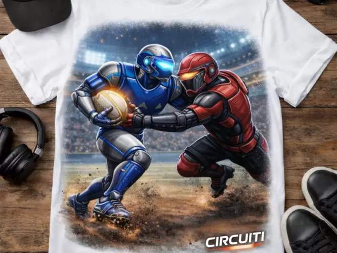 Entra nel cuore dell’azione con questa esclusiva t-shirt della collezione CIRCUITI, dove il rugby si evolve in uno scontro futuristico tra umanoidi.