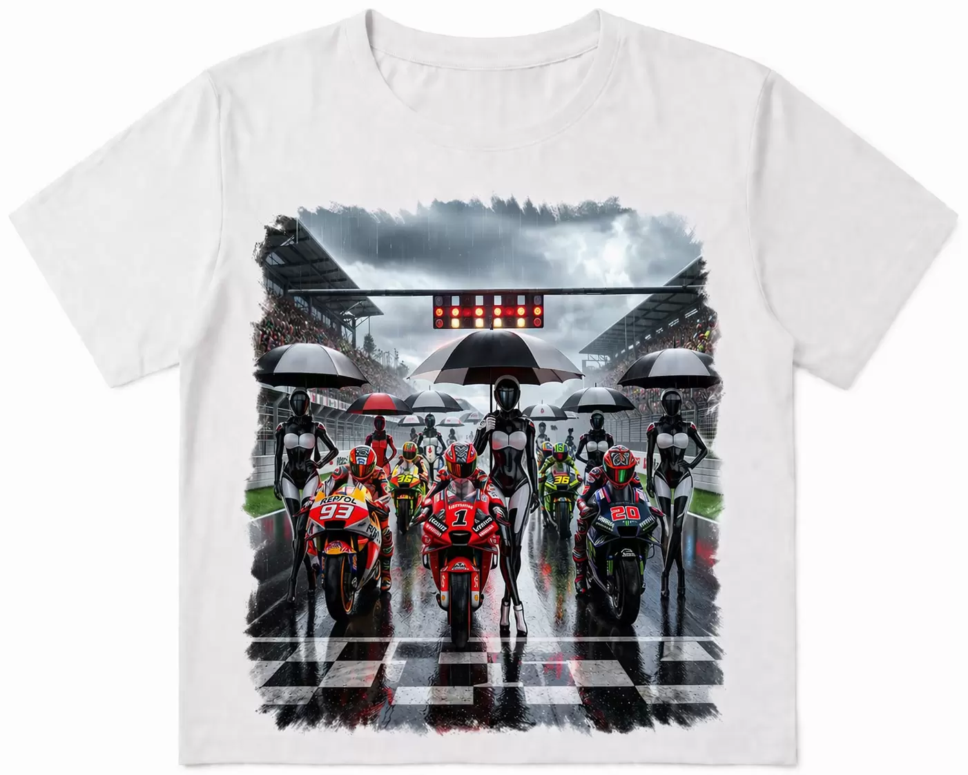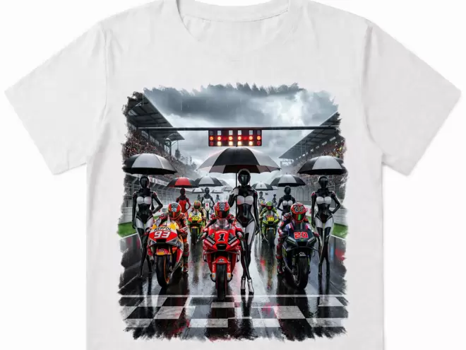 Porta tutta l’energia della pista direttamente nel tuo outfit con questa esclusiva t-shirt bianca dal design racing. La grafica ad alta definizione raffigura una scena mozzafiato sulla griglia di partenza: moto sportive pronte allo scatto, asfalto bagnato che riflette le luci e figure futuristiche con ombrelli che aggiungono un tocco unico e moderno.